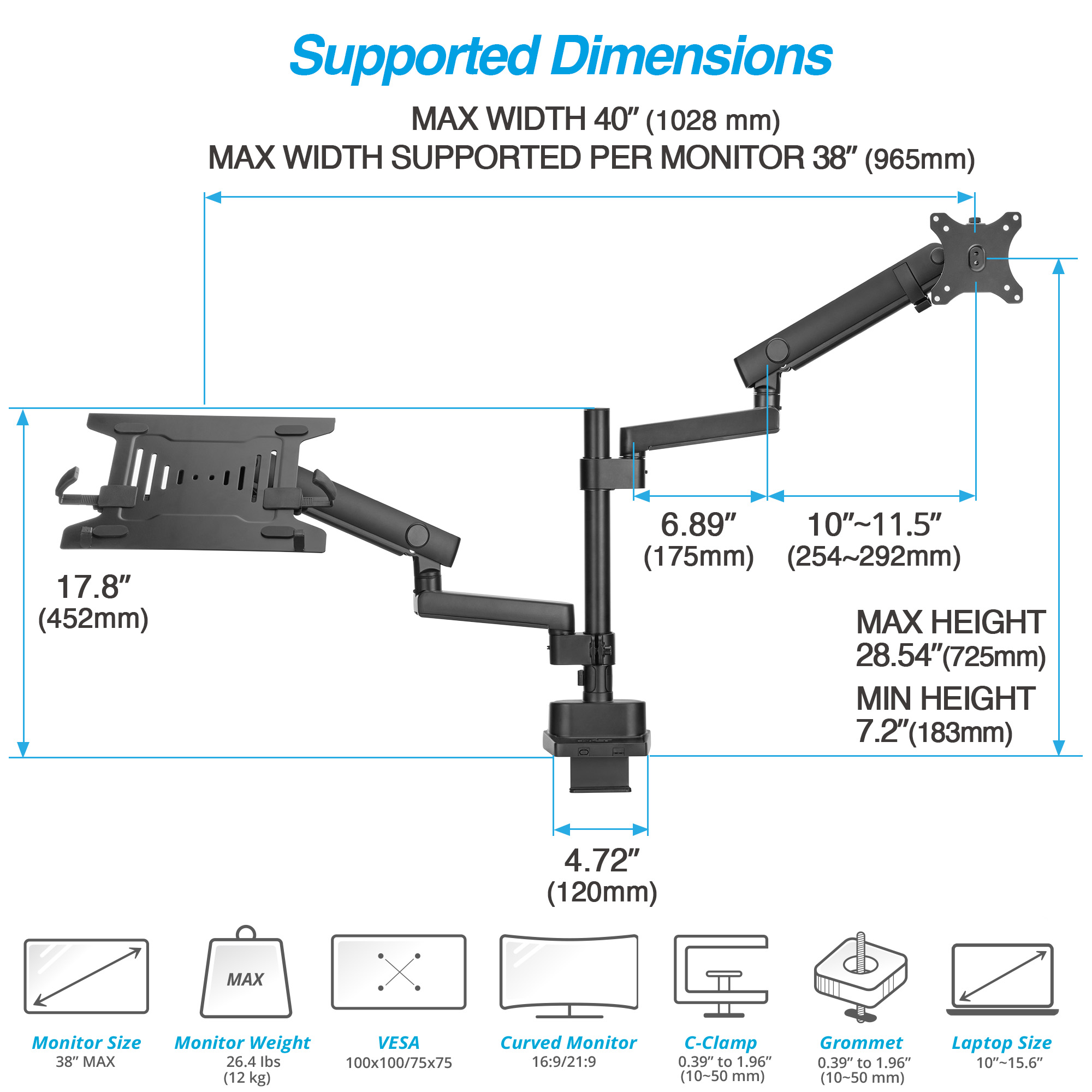 ■ Supports 17"-38" monitors up to 26.4 lbs (12 kg) and laptops with adjustable height along tall pole, tilt, swivel, and rotation. Features cable management, and easy to install top mount to avoid crawling under your desk. ■ 【Save Valuable Space 】 – Heavy-duty metal base only take up 4.72" x 3.94" (120mm x 100mm) desk surface. The c-clamp and grommet mounting options support up to 1.96" (50mm) desk thick. ■ 【Ergonomic Viewing Height 】 – Mechanical spring monitor arm assists height adjustment from 7.2" to 28.5" (183mm to 725mm). Adjusting the monitor adapts to your posture by arm extension, vertical tilt, horizontal swivel, and landscape or portrait rotation. ■ 【Stay Healthy & Focus 】 – New top mounting design simplicity the assemble process. After setup, the monitor mounts instantly improve working posture, increase workspace, hide cables, and discover the most productive self. ■ 【Cable Management 】 – Keeps your workspace professional and organized with the cables and wires tucked away neatly in the arms.