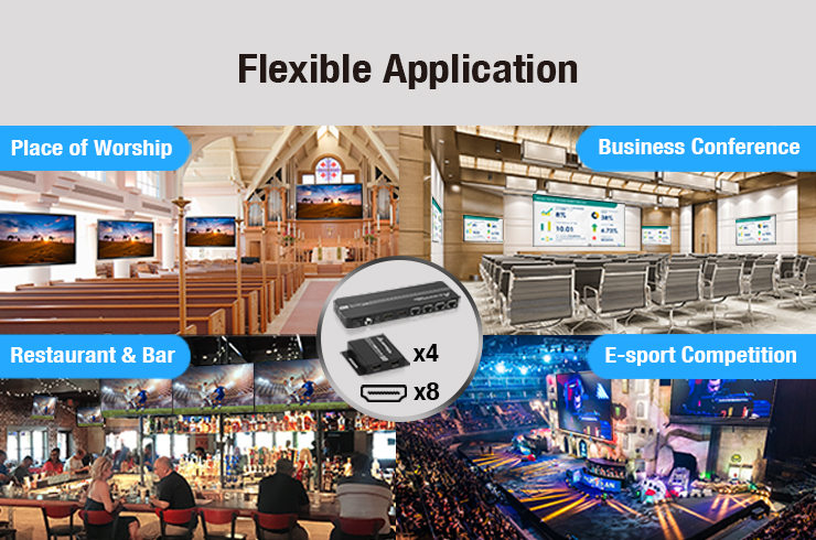 2. 1x4 Configuration: Seamlessly distribute signals to 8 monitors for a comprehensive multi-monitor display.