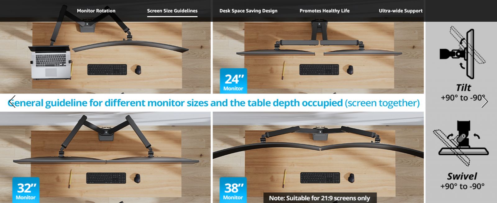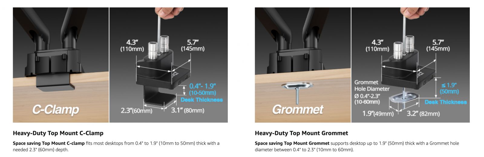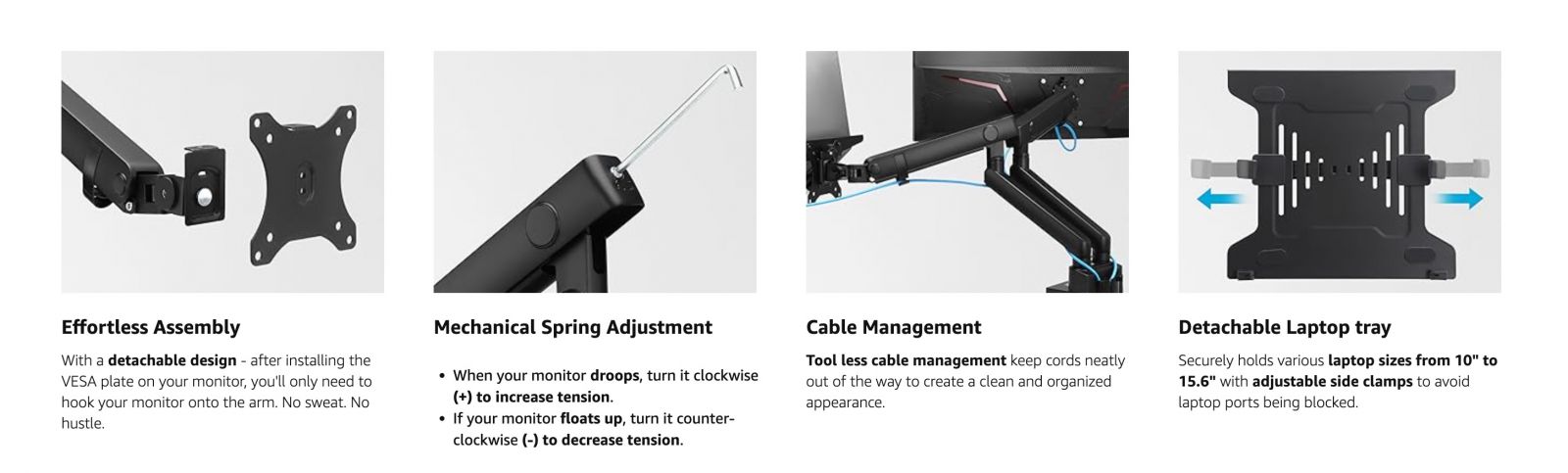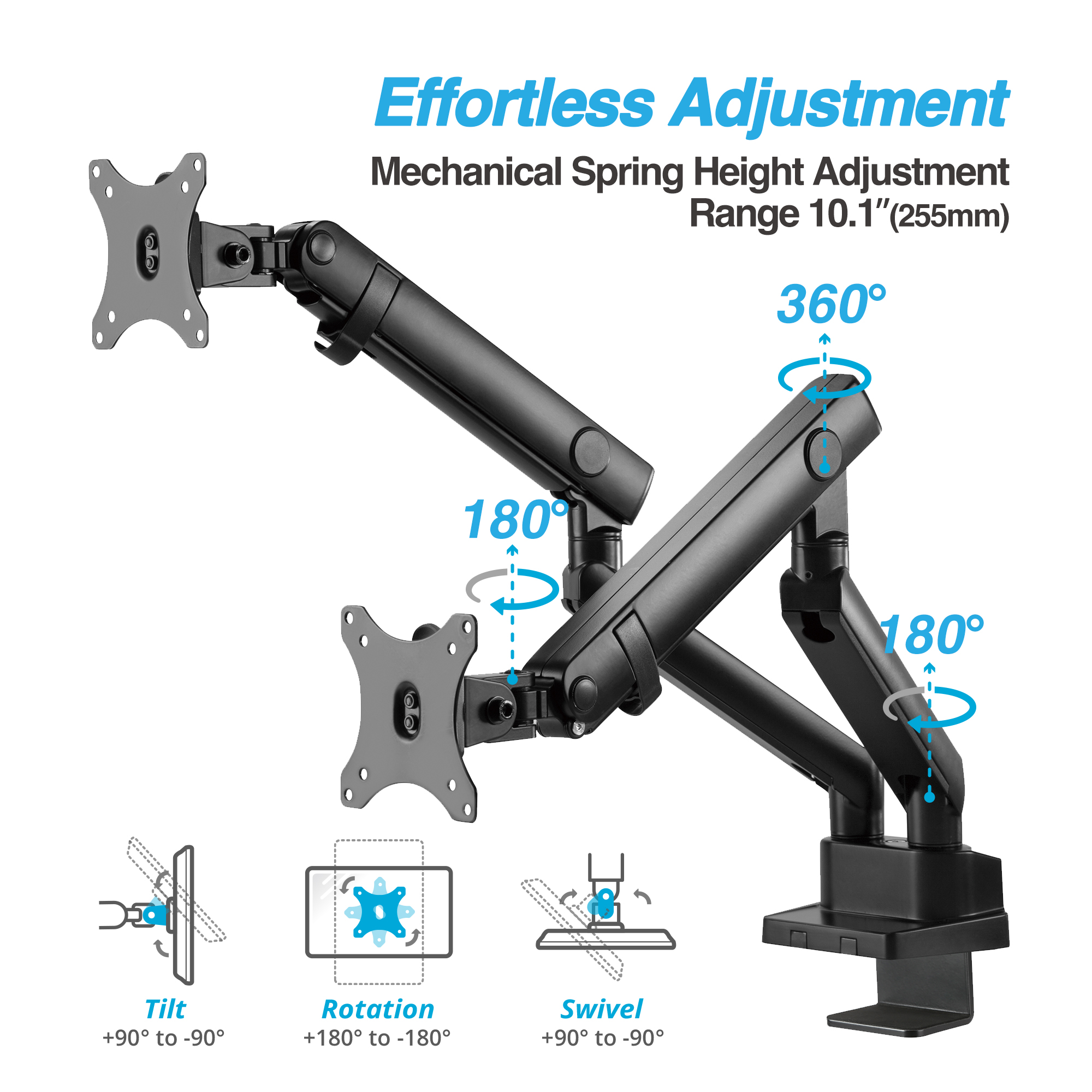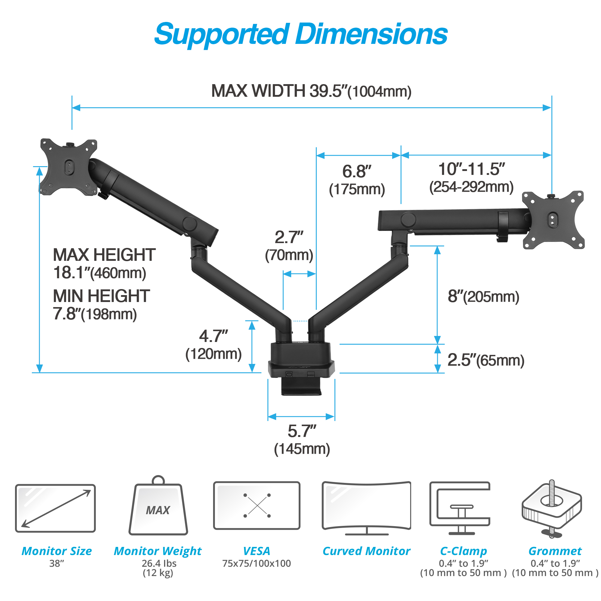 ■ Supports 17"-38" monitors up to 26.4 lbs (12 kg) and laptops with adjustable height, tilt, swivel, and rotation. Features cable management, and easy to install top mount to avoid crawling under your desk. ■ 【Fits Up to 15.6" Laptop & 38" Screen 】– Dual monitor desk mount fits most of flat/curved/ultrawide computer monitors up to 26.4 lbs (12 kg) each in weight with VESA 75x75mm or 100x100mm mounting holes. ■ 【Save Valuable Space 】– Heavy-duty metal base only take up 5.7" x 4.3" (145mm x 110mm) desk surface. The c-clamp and grommet mounting options support up to 1.9" (50mm) desk thick. ■ 【Ergonomic Viewing Height 】– Mechanical spring monitor arm assists height adjustment from 7.8" to 18.1" (198mm to 460mm). Adjusting the monitor adapts to your posture by arm extension, vertical tilt, horizontal swivel, and landscape or portrait rotation. ■ 【Stay Healthy & Focus 】– New top mounting design simplicity the assemble process. After locking a few screws, the monitor mounts instantly improve working posture, increase workspace, hide cables, and discover the most productive self.