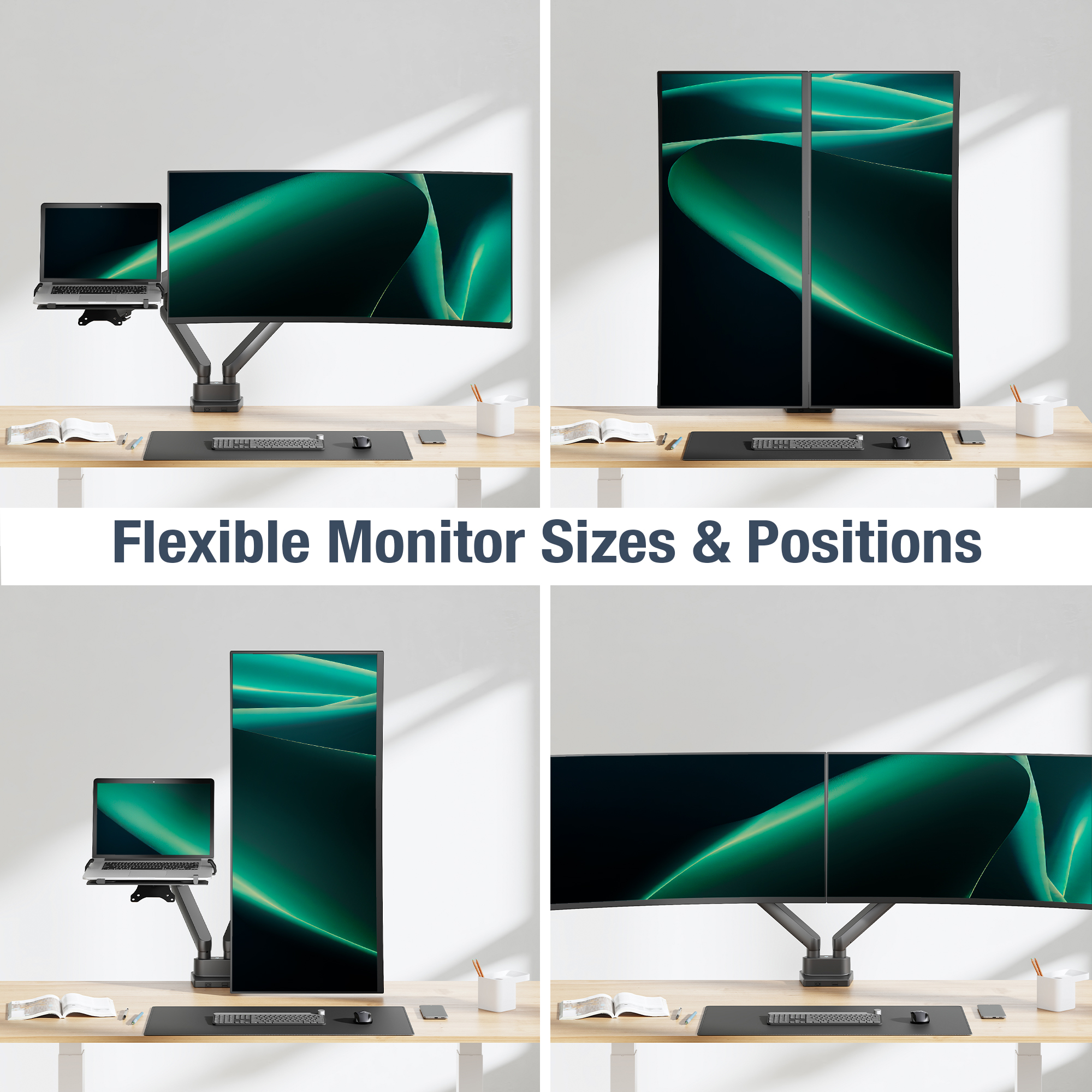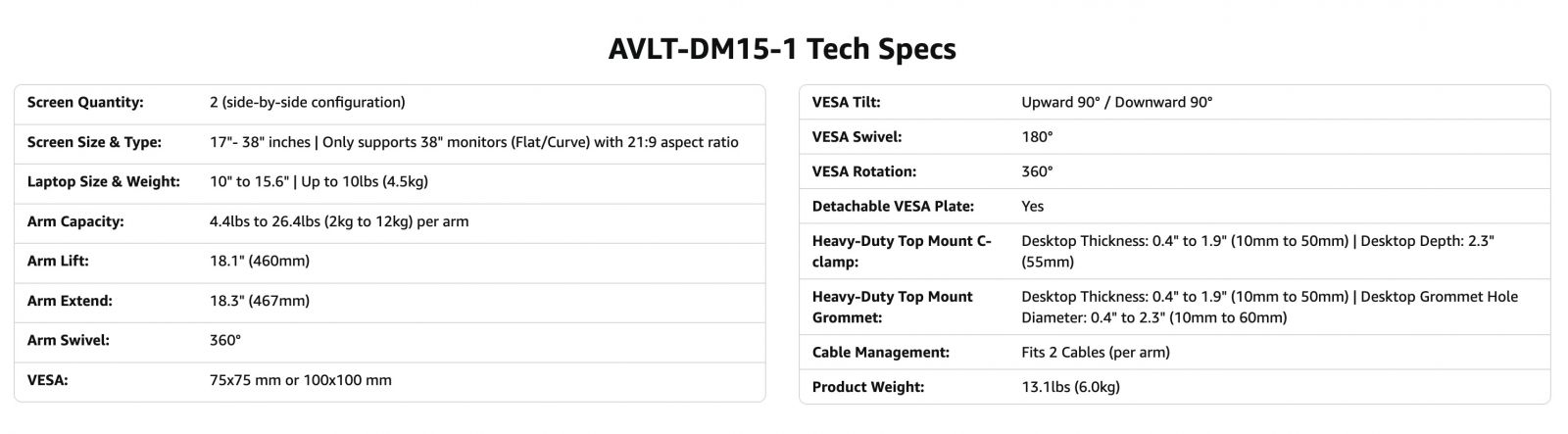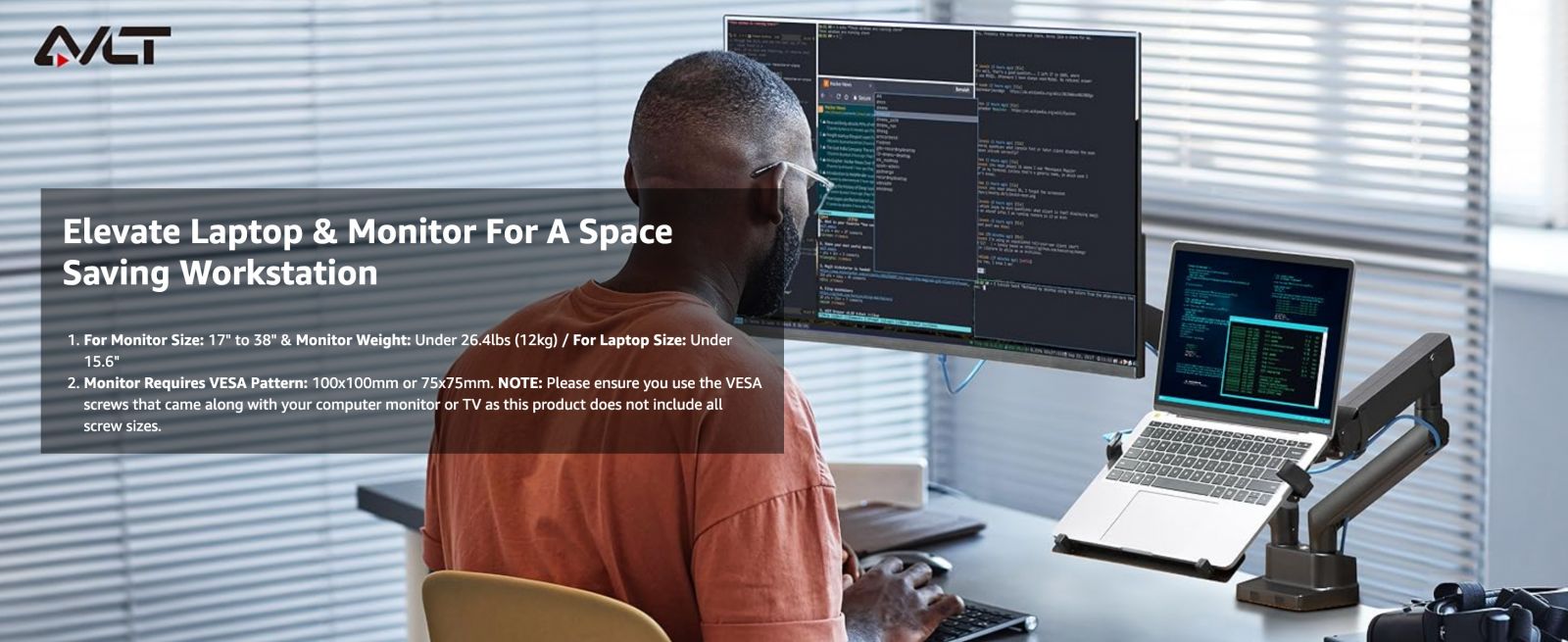- AVLT Laptop and Monitor Arm - Mount 15.6" Notebook and 38" Monitor on 2 Full Motion Adjustable Arms - Organize Your Work Surface with Ergonomic VESA Monitor Mount