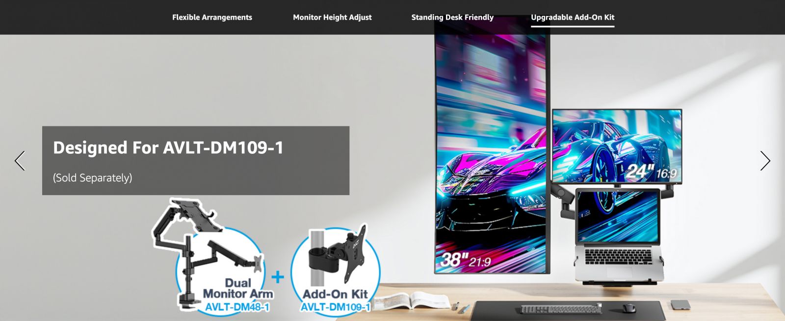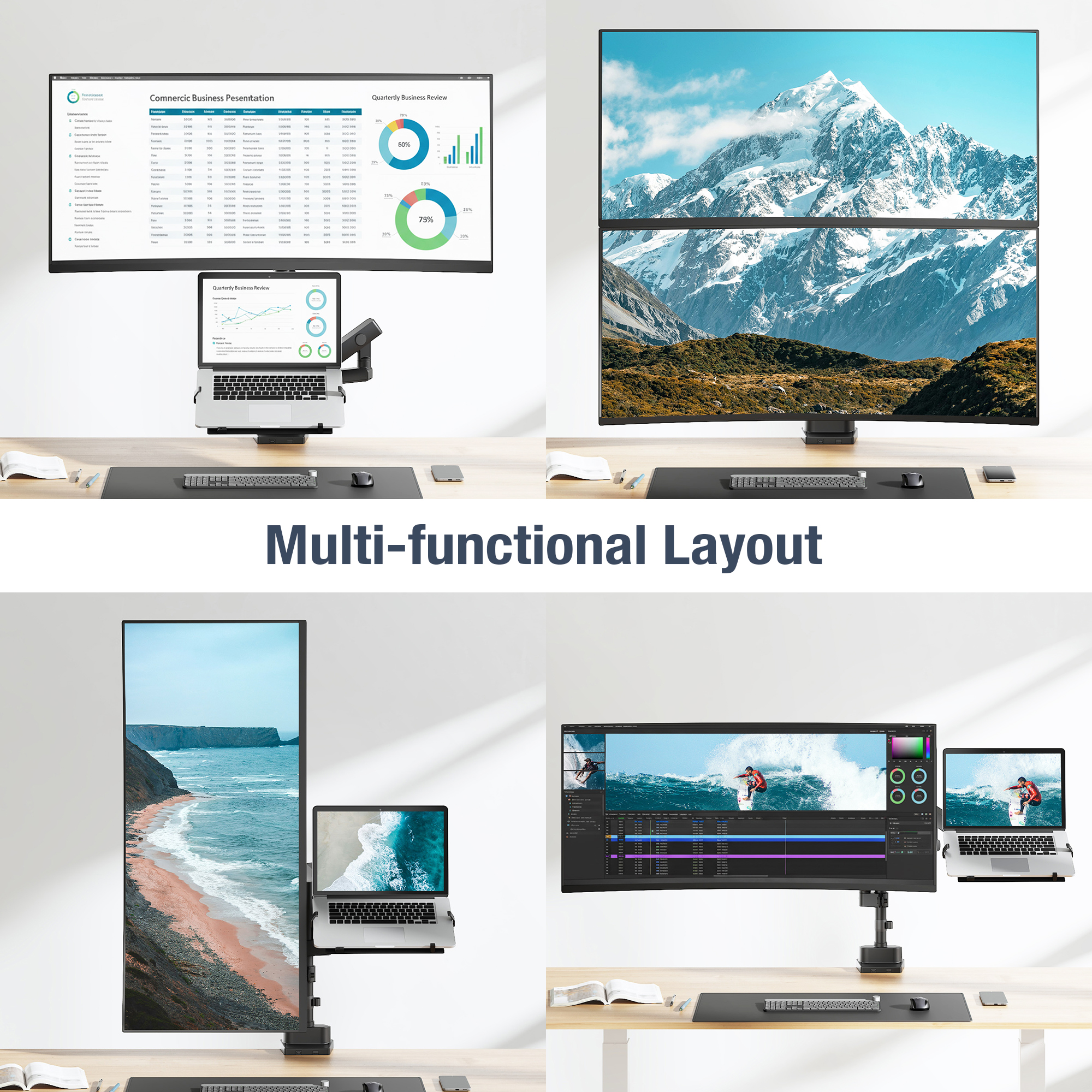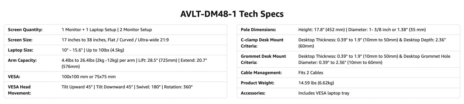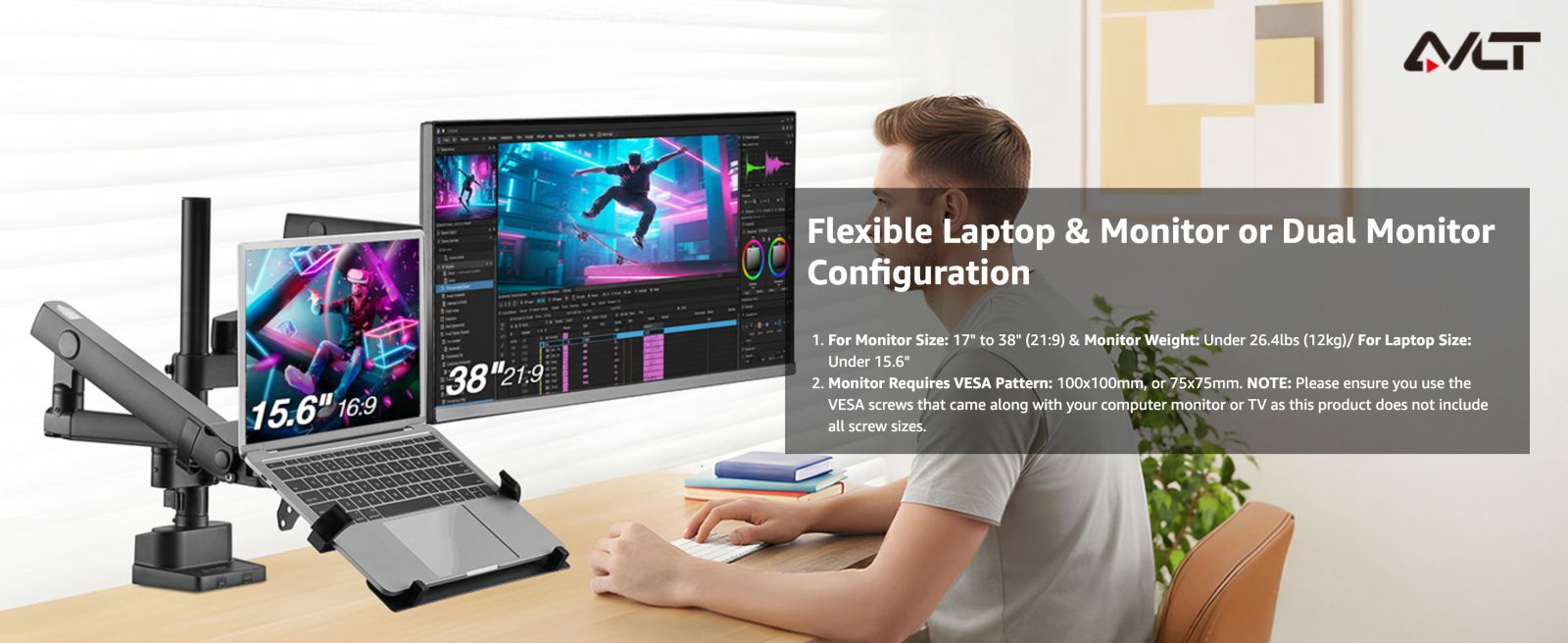 - AVLT Laptop & 38 Inch Monitor Arm Pole Top Mount-Black, Supports 26.4 lbs (12 kg), Stacked Monitor, VESA Compatible, Ultrawide Screen Fit, Adjustable Height, Tilt Swivel Rotate, Cable Management