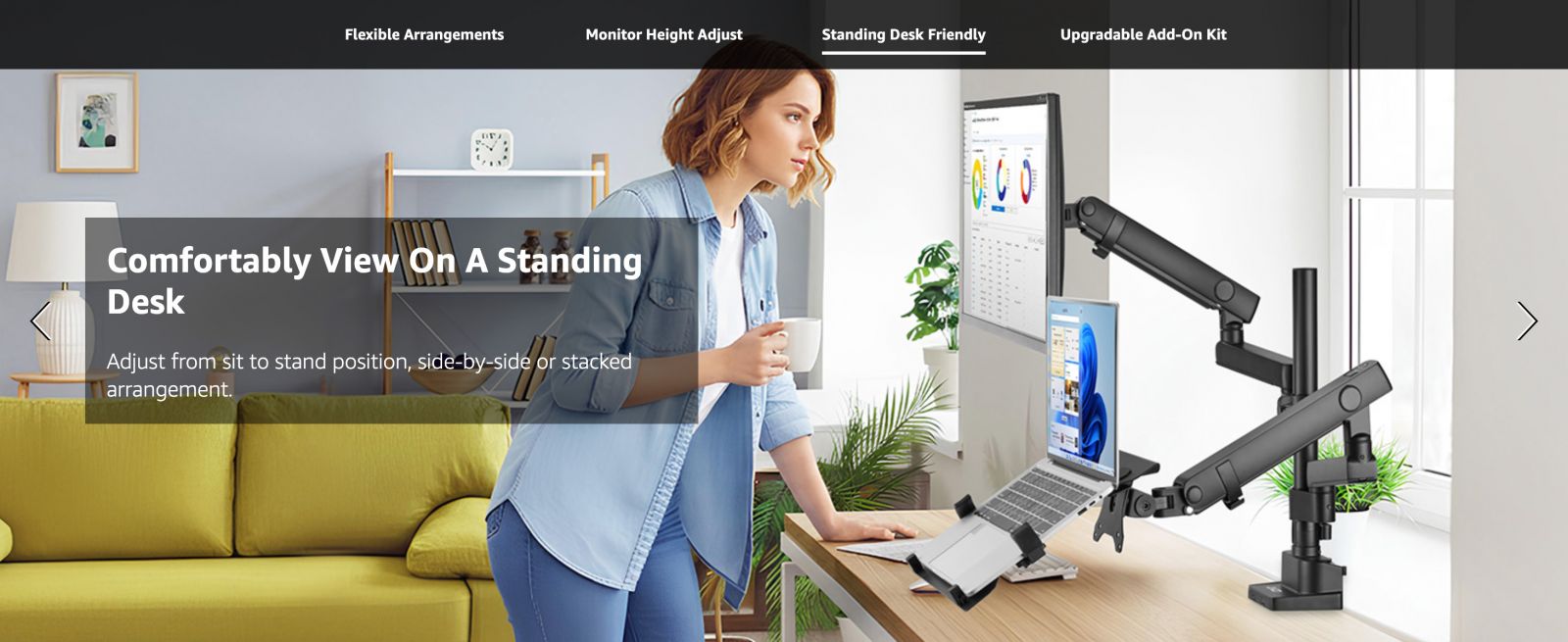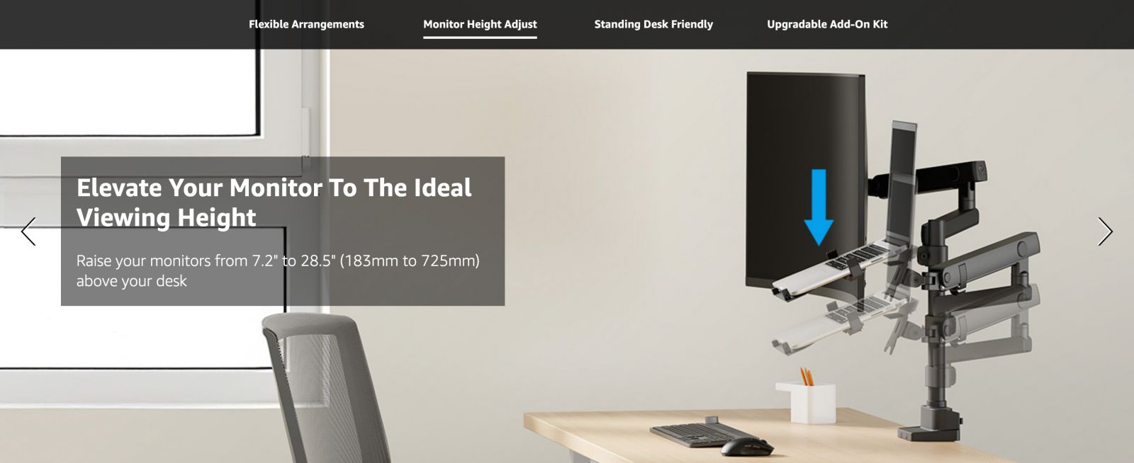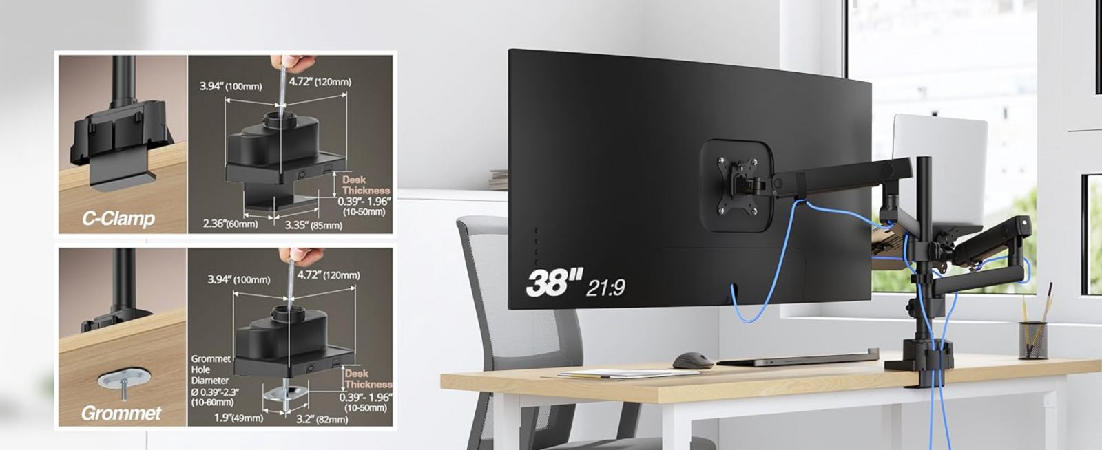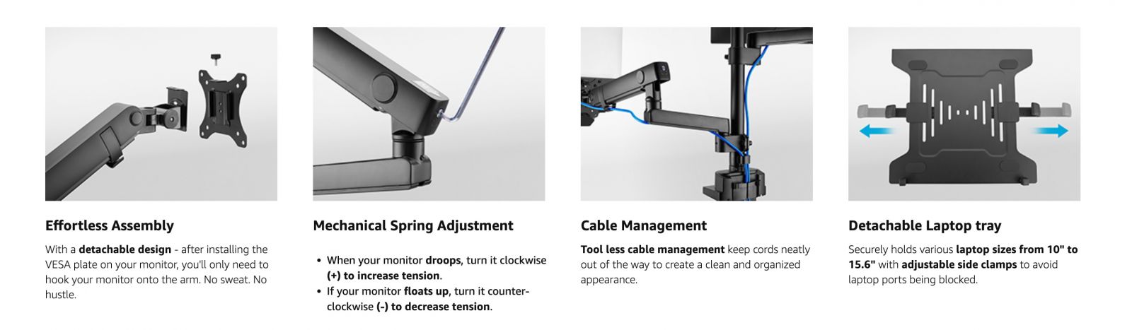 ■ Supports 17"-38" monitors up to 26.4 lbs (12 kg) and laptops with adjustable height along tall pole, tilt, swivel, and rotation. Features cable management, and easy to install top mount to avoid crawling under your desk. ■ 【Save Valuable Space 】 – Heavy-duty metal base only take up 4.72" x 3.94" (120mm x 100mm) desk surface. The c-clamp and grommet mounting options support up to 1.96" (50mm) desk thick. ■ 【Ergonomic Viewing Height 】 – Mechanical spring monitor arm assists height adjustment from 7.2" to 28.5" (183mm to 725mm). Adjusting the monitor adapts to your posture by arm extension, vertical tilt, horizontal swivel, and landscape or portrait rotation. ■ 【Stay Healthy & Focus 】 – New top mounting design simplicity the assemble process. After setup, the monitor mounts instantly improve working posture, increase workspace, hide cables, and discover the most productive self. ■ 【Cable Management 】 – Keeps your workspace professional and organized with the cables and wires tucked away neatly in the arms.